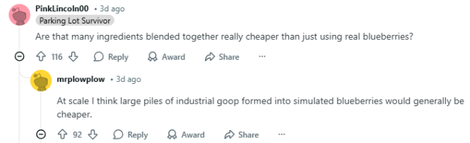 一位网友心生疑问:“把那么多原料混合在一起真的比直接用新鲜蓝莓便宜吗?”另一位网友回复说:“我觉得大规模生产的话,用工业糊状物制成人造蓝莓通常会更便宜。”而且,这种工业糊状物肯定比新鲜蓝莓更容易保存。