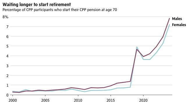 加拿大越来越多人士正在改变领取养老金的习惯,选择延迟到70岁才开始领取加拿大养老金计划(CPP)。这一做法在2016年前的比例不足1%,而到2024年已经快速增长至7%以上,反映出更多加拿大人开始认同延迟领取。