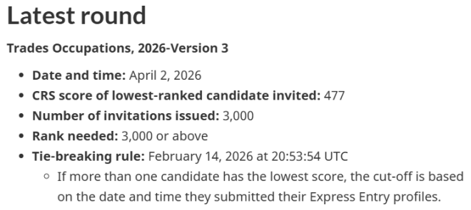 今日(4月2日),加拿大、难民及公民部(IRCC)通过Express Entry系统发出了新一轮申请邀请(ITA)。本次抽签面向技工职业类别(Trades Occupations)的候选人,共计3,000人获邀申请。