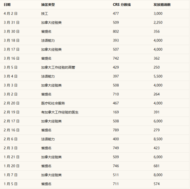 2026年以来,加拿大移民部主要将重点放在境内移民候选人上,尤其是拥有省提名和加拿大工作经验的申请人。2026年各类型Express Entry抽签次数如下: