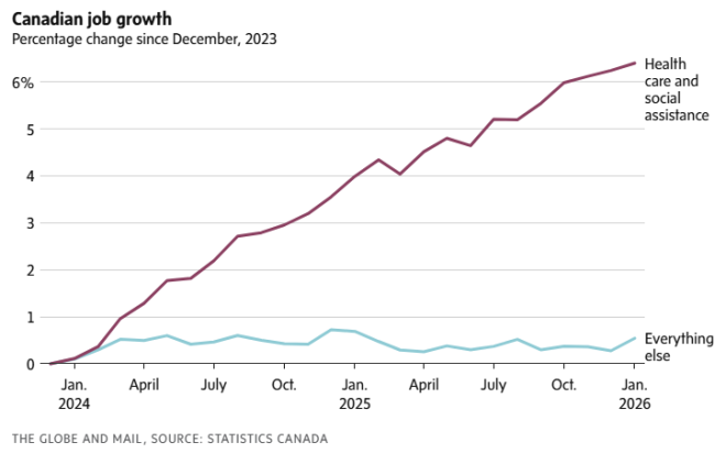加拿大统计局的薪资数据显示,自2023年底以来,医疗和社会援助行业的就业人数增加了6.4%,约15万个岗位。这几乎是其他所有行业增长速度的两倍——同期其他行业净增岗位仅约8.6万个。