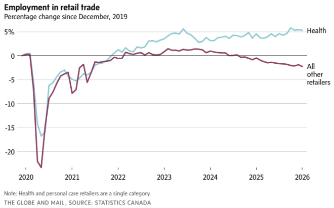 眼科和牙科护理的开销也在增加。截至1月,健康和个人护理零售商(涵盖药房、健康食品店等)共计约22万个岗位,自2019年底以来增长了5.3%。这是零售业罕见的增长领域:其他零售商合计减少了4万个岗位,跌幅为2.2%。