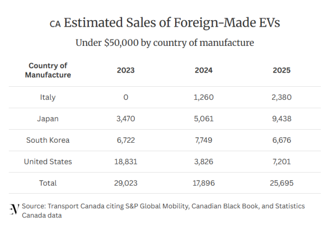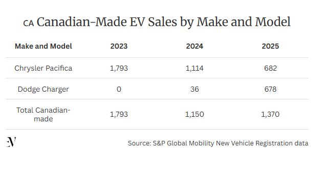 统计数据显示,加拿大2025年本土制造电动车销售总数1,370辆,较2023年的1,793辆下降23.6%。其中Pacifica销售暴跌62% — 从1,793辆降至682辆。与此同时,5万元以下进口电动车数量大增。