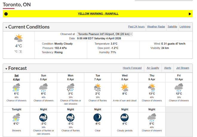 加拿大环境部表示,本周末多伦多可能迎来显著降雨,总降水量预计在20至40毫米之间。