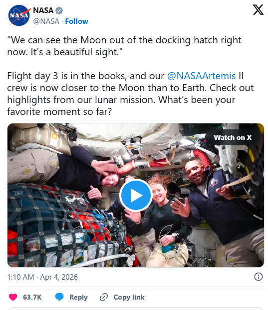 截止今天,阿尔忒弥斯二号宇航员已完成超过一半的旅程,月球飞掠的准备工作正在进行中,计划在下周一绕月背面的飞行期间,将拍摄更多的图像。