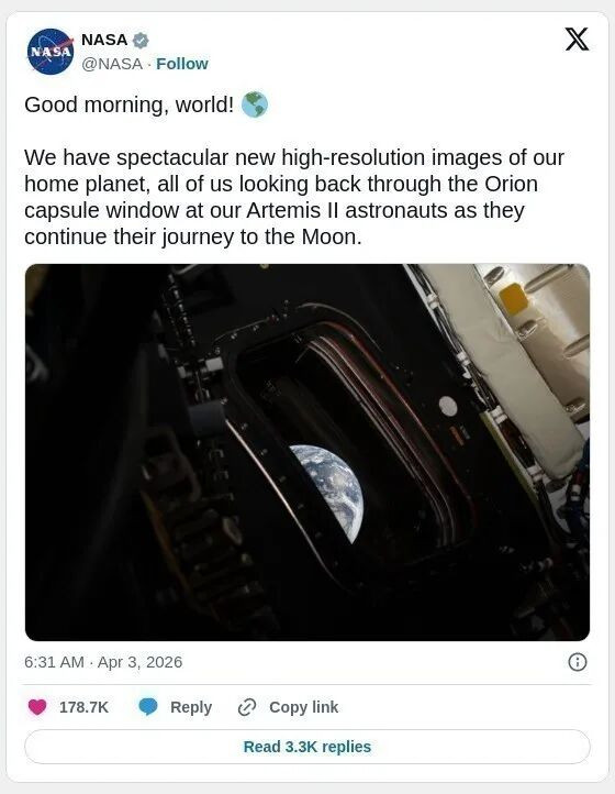 NASA休斯顿约翰逊航天中心任务控制形容其中一张照片为“提醒我们,无论走多远,地球始终是一个整体,我们同在此地,仰望、希望并追求更高的目标”。