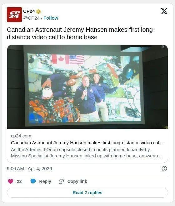 加拿大宇航员杰里米·汉森(Jeremy Hansen)在阿尔忒弥斯 II 号猎户座飞船接近预定月球绕飞点时,与地面指挥中心连线,回答了在魁北克朗格伊尔加拿大航天局半夜聚集的记者提问。
