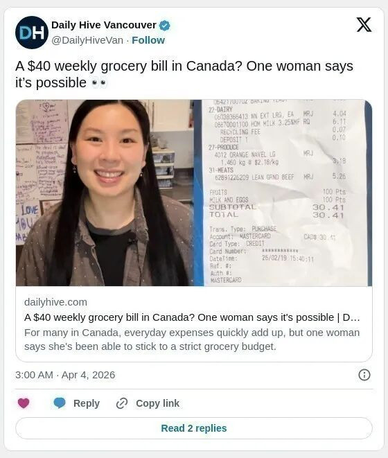 根据dailyhive的报道,31岁的Michelle Nijdam近期在社交平台走红。她在YouTube频道“MichellesHomemaking”分享自己如何在大温地区以每周40加元(约合每月160加元)的严格预算生活,并记录挑战过程中的经验与心得。