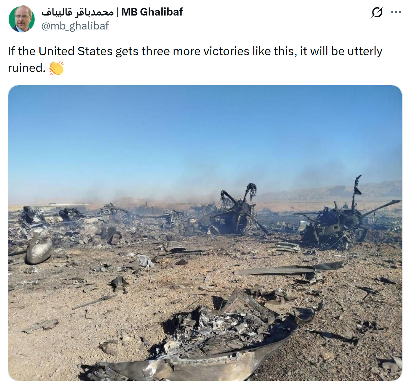 伊朗议长卡利巴夫发文嘲讽:如果美国再像这样赢3次,将被彻底毁灭。