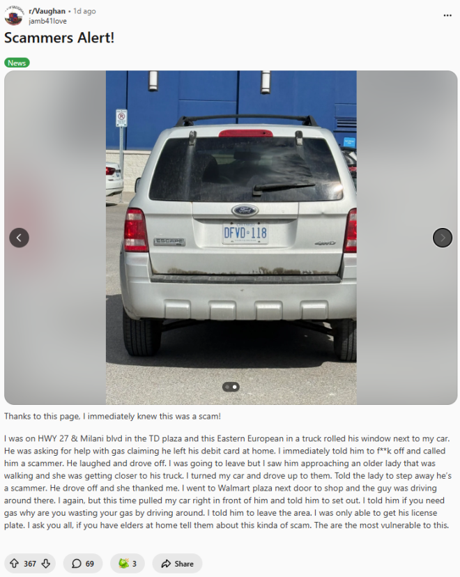 帖主描述道:“我当时在HWY 27和Milani大道的TD广场附近,一辆汽车停在我车旁,一个东欧人摇下车窗跟我说他需要帮忙加油,说自己把借记卡忘在家里了。我立刻回他‘滚开’,还骂他是骗子。他笑了笑就开走了。”