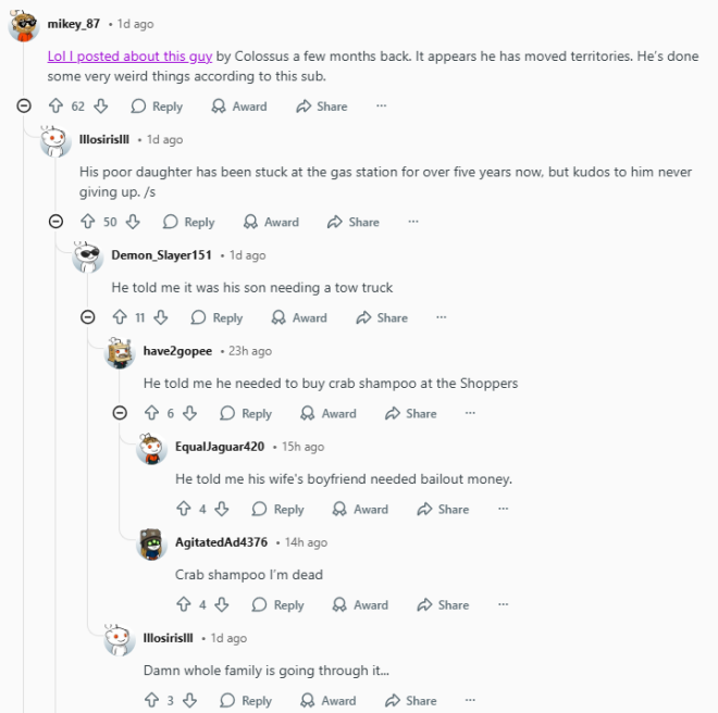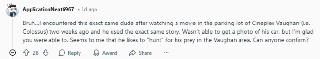 据更多网友描述,这名男子早已是个“惯犯”,曾经以各种理由向人索要现金。例如,他曾告诉一位网友是儿子需要拖车;又对另一位说要在Shoppers买洗发水;甚至还声称妻子的男友需要保释金。有网友调侃,骗子”坚持不懈”,全家人都被他用了个遍。
