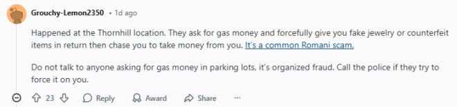 此外,Thornhill也出现过类似的街头行骗。骗子会强行塞给你假首饰等假货,随后再追着你要钱。网友曾遇到骗子以卖手表、戒指等理由骗钱,实际物品为假。还有的骗子会用”芯片损坏”的银行卡博取同情。