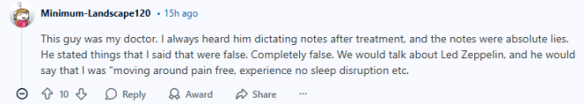“这个人曾经是我的医生。我每次治疗结束后,都能听到他在口述病历记录,但那些内容完全是编造的。他说我讲过的一些情况,根本就是假的,完全不属实。有一次,我们明明只是聊一些像Led Zeppelin这样的音乐,他却在记录里写成我‘活动自如、没有疼痛,也没有睡眠问题’等等。”