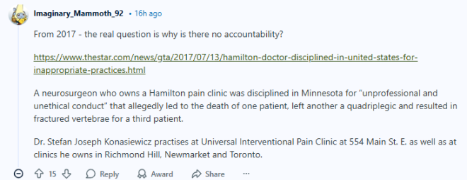 在监督期结束后,Konasiewicz的执业情况由一名经CPSO批准的评估人员重新审核。评估指出,在15份患者病历中,他有12份“未达到应有的医疗标准”。2024年4月10日的一份报告总结写道:“他的治疗方案并没有根据治疗结果作出调整。即使有证据表明治疗无效,他仍然每周或隔周重复进行多次注射,没有任何改变。”