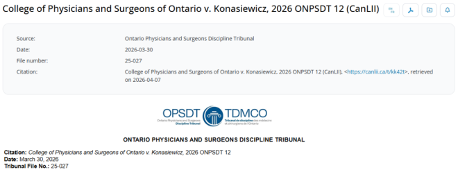根据College of Physicians and Surgeons of Ontario(安省医生与外科医生协会)在2月9日作出的决定,一个由五人组成的委员会对Stefan Joseph Konasiewicz作出处罚。该医生在多伦多、汉密尔顿和新市(Newmarket)都设有诊所,并且早在2022年就因另一起专业能力不足的指控,接受过为期一年的医疗监督。