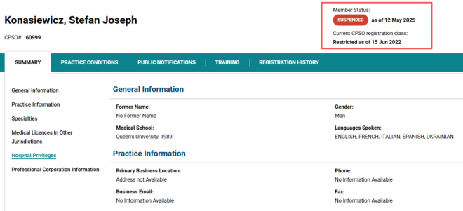 除了停牌之外,Konasiewicz还需要出席委员会接受正式训诫。同时,在停牌结束后,他还必须自费聘请另一名临床监督医生,对其执业进行为期12个月的监督。