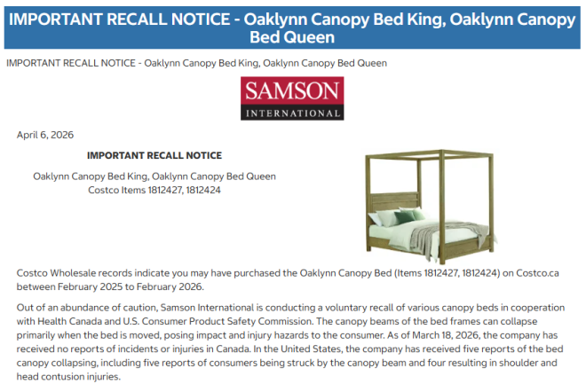 Costco周一(4月6日)在其网页上发布了一则“重要召回通知”,称“Oaklynn Canopy”品牌的加大号(King)和标准号(Queen)天篷床正被制造商召回。