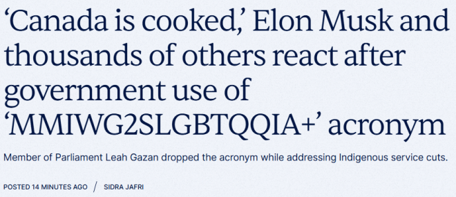 特斯拉CEO埃隆·马斯克今天在社交媒体平台X的一句吐槽,直接把加拿大政府最新使用的一串16个字母缩写“MMIWG2SLGBTQQIA+”送上舆论风口浪尖。