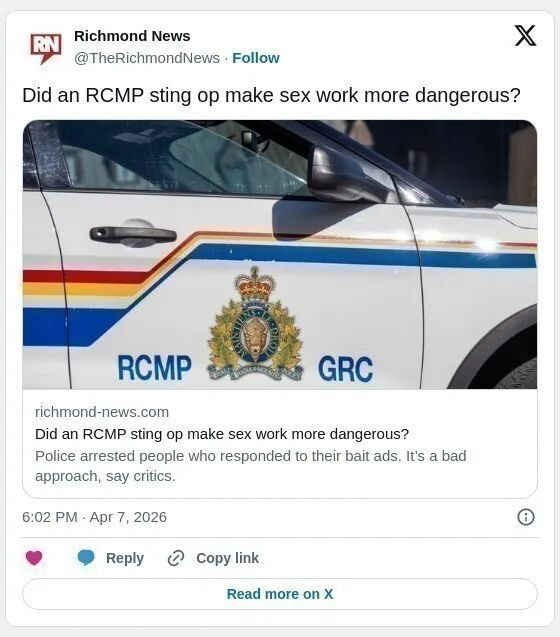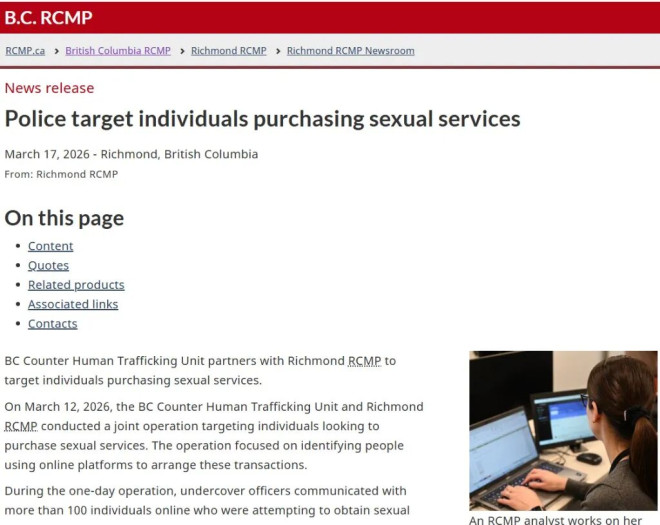 3月17日,列治文RCMP发布新闻稿称,他们完成了一次为期一天的网络抓嫖行动:警员通过网络假扮性工作者,与超过100人互动,并在潜在客户出现时进行逮捕。目前,所有被拘人员已获释,尚无正式指控提出。