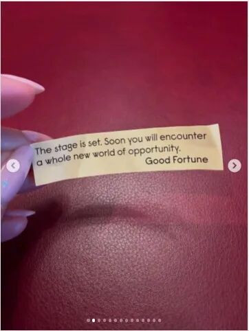 此外,她还晒出一张“幸运饼干”纸条,上面写着:“舞台已搭好,你即将迎来全新的机遇世界”。再度引发网友无限联想。