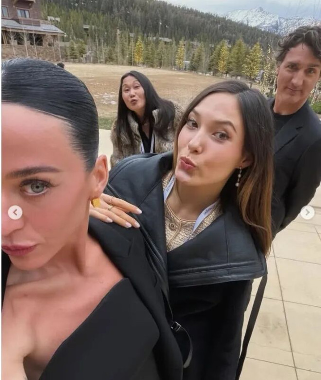 该系列照片中的有一张照片包括了谷爱凌母女、特鲁多以及特鲁多的女友水果姐-流行歌星凯蒂·佩里(Katy Perry)。