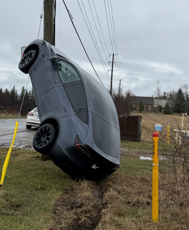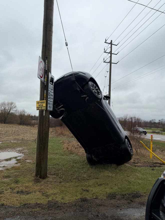 上周末早上,密西沙加市一名 20 岁女子在 Burlington 驾车时,因道路湿滑,车辆意外冲上电线杆支撑线,场面惊险。