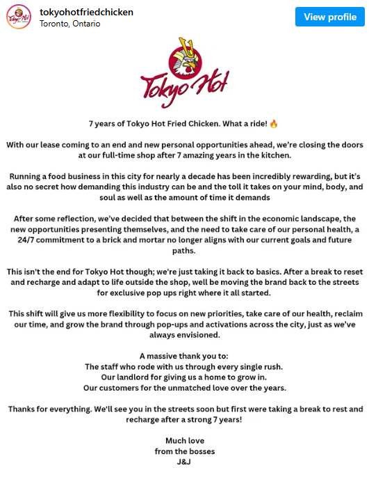 多伦多一家以“日式×美式辣味”风格走红的炸鸡店Tokyo Hot Fried Chicken宣布关闭其常规实体门店。经营七年后,品牌将转向街头快闪和活动模式继续运营。