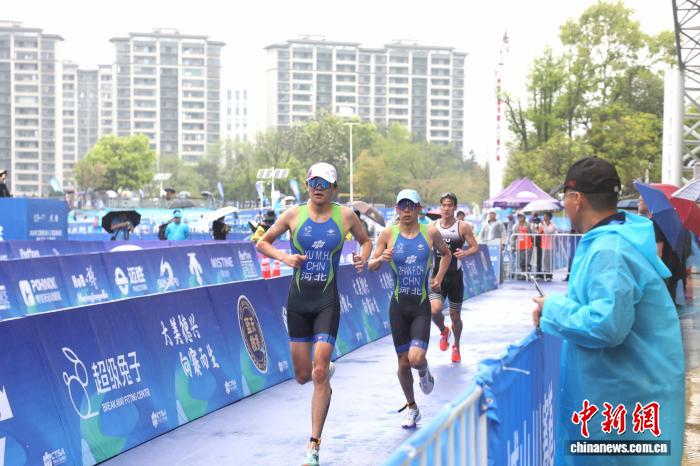 随后进行的女子优秀组比赛中,雨势陡然增大,给选手们带来了更大挑战。中国选手杨一凡纵身跃入湖水中,顶着雨水奋力劈波斩浪。与男子组自行车赛段一样,女子组的竞争也同样激烈,杨一凡等三名选手冲在第一方阵,交替领骑,始终没有拉开太大差距。最终,杨一凡以2小时2分53秒的成绩锁定女子优秀组冠军。