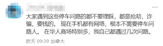 “大家遇到这些停车问路的都不要理睬,都是抢劫,诈骗,要钱的。 现在手机都有网络,根本不需要停车问路人。 在华人商场特别多,我自己都遇过几次问路。”