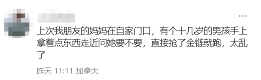 “上次我朋友的妈妈在自家门口,有个十几岁的男孩手上拿着点东西走近问她要不要,直接抢了金链就跑,太乱了!”