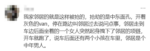 “我家邻居的就是这样被抢的,抢劫的是中东面孔,开着灰色的van,停在路边叫邻居过去说问点事,邻居走到车边后面坐着的一个女人突然起身拽下了邻居的项链,开车就跑了,说车后面还有两个小孩在车里,邻居是个中年男人。”