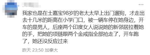“我家也是在士嘉宝98岁的老太太早上出门遛狗,才走出去十几米的距离在小学门口,被一辆车停在她身边,开车的是男人,后座两个印度女人说说她的新邻居拉着她的手,把她的项链跟两个金戒指全部抢走了,开车跑了,她还没反应过来。”