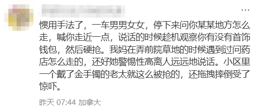 “惯用手法了,一车男男女女,停下来问你某某地方怎么走,喊你走近一点,说话的时候趁机观察你有没有首饰钱包,然后硬抢。我妈在弄前院草地的时候遇到过问药店怎么走的,还好她警惕性高离人远远地说话。小区里一个戴了金手镯的老太就这么被抢的,还拖拽摔倒受了惊吓。”