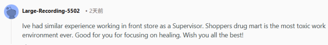 网友@Large-Recording-5502:“我以前在前台当主管的时候也有过类似的经历。Shoppers Drug Mart的工作环境简直糟透了。恭喜你解脱了,专注自己的身心恢复,祝好!”