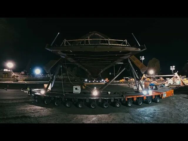 随后,整座桥梁被安装在大型轮式运输平台上。然后由两台由计算机控制的运输平台将重达约400吨的桥体精准移动,并“旋转”至其最终位置,跨越高速公路。