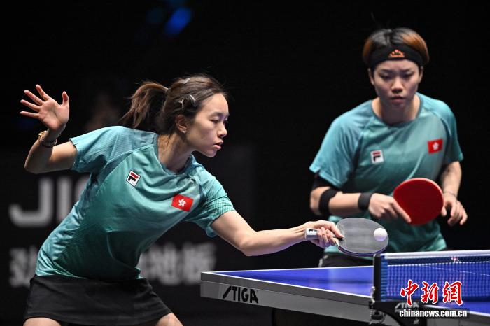 4月12日,WTT常规挑战赛太原站收官,中国香港组合杜凯琹/吴咏琳(左)在女双决赛中。记者 韦亮 摄