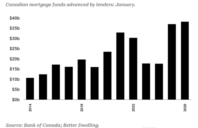 根据加拿大央行的数据,2026 年 1 月,银行发放的未投保房贷总额高达 383 亿加元,比去年同期增长 3.3%(增加 12 亿加元),创下有记录以来的 1 月新高。虽然总体贷款规模再创新纪录,但年增长率已降至近两年来的最低水平,显示市场热度有见顶迹象。