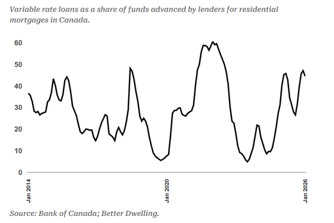 更引人关注的是,选择浮动利率的借款人数量大幅上升。2026 年 1 月,浮动利率房贷占所有新发放贷款的比例接近 45%,相比 2023 年 7 月的历史低点 4.9%,出现大幅反弹。加拿大人通常倾向于固定利率以规避利率波动风险,但自 2020 年大幅降息以来,浮动利率一度占据主导,2022 年初甚至达到近 60% 的高峰,随后因加息周期急剧下降。