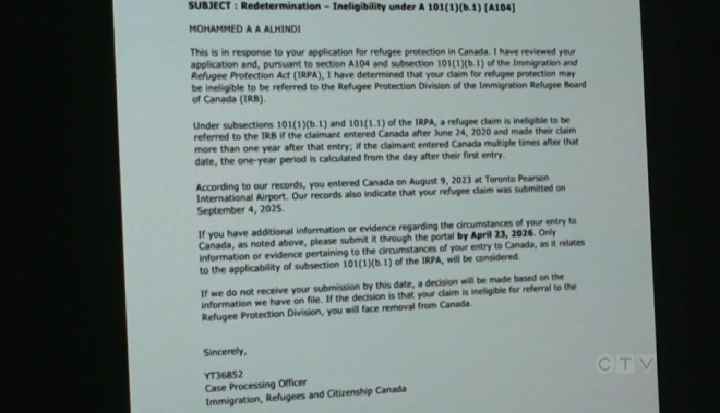 根据他在2026年4月2日从移民部(IRCC)收到的一封“程序公正信”(procedural fairness letter),他是在2025年9月4日提交的难民申请。信中指出他首次入境加拿大的时间为2023年8月9日,并要求他在4月23日前补充材料。同时警告称,他的申请可能不会被转交至难民保护部门(Refugee Protection Division Canada)——也就是负责审理难民申请的主要机构。