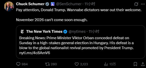 《纽约时报》也评价称,12日,被“MAGA斗士”和欧洲右翼民粹主义者奉为“指路明灯”的欧尔班承认败选,打断了特朗普推动的全球民族主义复兴的势头。