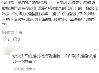 一位亲历乘客分享了完整经历:“我们就在4月10日这班AC29上,本来就是前一班航班取消后改签的,结果飞出去1小时又折返。换飞机后延误了7个小时,还得重新改签北京到上海的后续航班,真的被折腾到不行。”