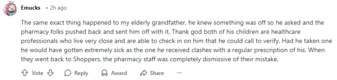 “我年迈的祖父也遇到过一模一样的情况。他当时觉得不对劲,就去问,结果药房的人还坚持说没问题,把药给他带走了。幸好他的两个孩子都是医疗从业人员,而且住得很近,他可以打电话确认。要是他真吃了那药,后果会非常严重,因为那药会和他平时的处方产生冲突。后来他们回到Shoppers反映问题时,药房人员对自己的错误完全不当回事。”