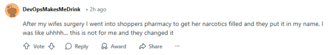 “我老婆手术后,我去Shoppers药房帮她取止痛类处方药,结果他们把药开在我名下。我当时就说:‘呃……这不是给我的。’然后他们才改过来。”