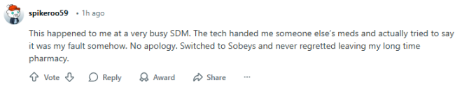 “我也在一家特别忙的Shoppers遇到过类似情况。工作人员把别人的药递给我,甚至还试图把责任推到我身上。连句道歉都没有。我后来换去了Sobeys的药房,从此再也不后悔离开原来的老药房。”