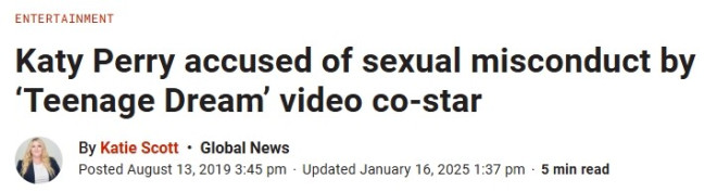 Katy Perry曾在2019年被一名模特指控性行为不当,该模特曾出演她2010年歌曲《Teenage Dream》的音乐视频。Josh Kloss 指控这位歌手在一家轮滑场当众暴露他。
