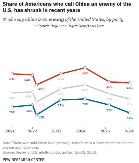 调查还发现,美国人对美中关系的认知也在发生变化,约28%的受访者坚持将中国视为“美国的敌人”,少于2025年的33%。不过,60%的美国人依然将中国视为“竞争对手”。