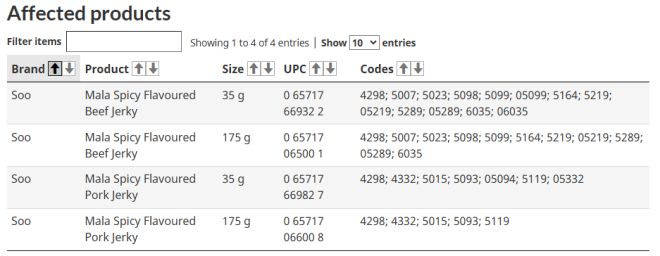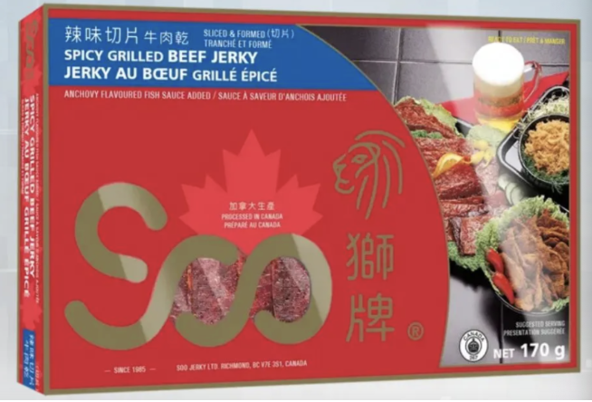 加拿大食检局(CFIA)于4月13日发布通告,宣布对4款狮牌(Soo)麻辣牛肉干和猪肉干实施召回,原因是相关产品可能存在霉菌污染。