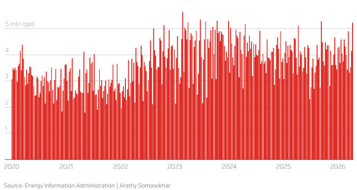 然而,分析师和交易商表示,美国正在迅速接近其原油出口能力上限(约600万桶/日)。