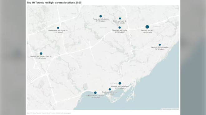 多伦多全市闯红灯罚单最多的前 10 个地点(CTV News 图片)
