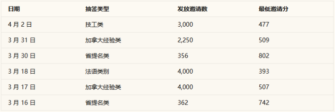 而 3 月 31 日上一轮 CEC 抽签同样发出 ITA 数大幅下滑,显示该群体邀请规模趋于缩减。
